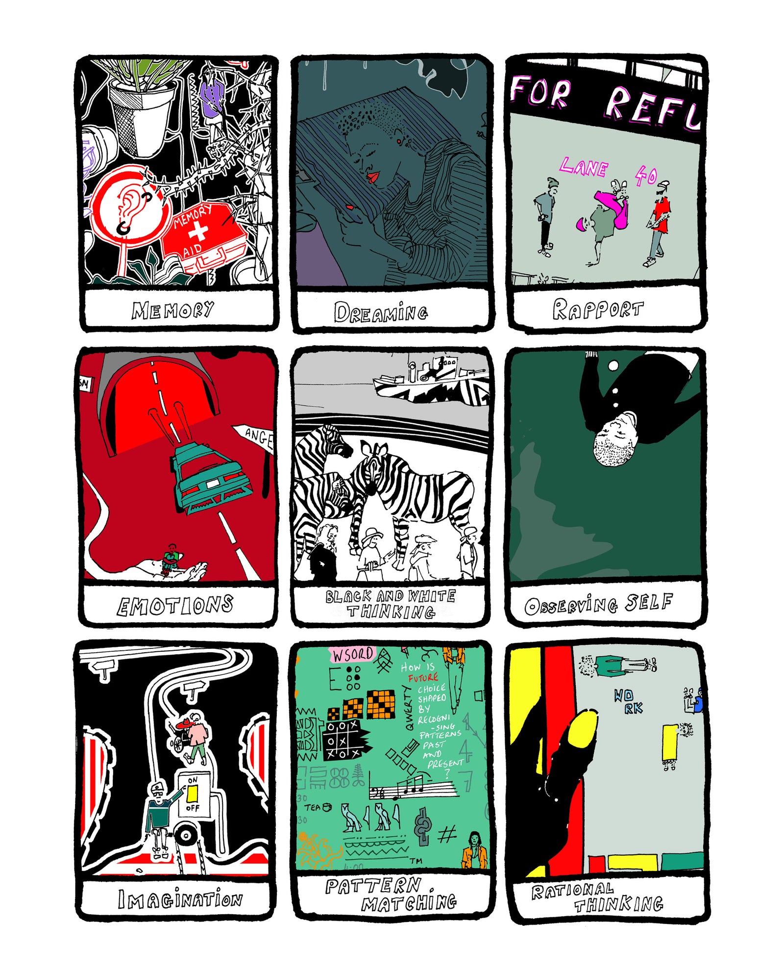 The first set of prompts included sleep, purpose, status, achievement, food and drink, movement, connection, community, privacy, control and security. The second set focused on imagination, memory, self, pattern recognition and rapport.